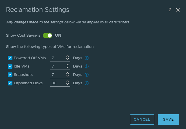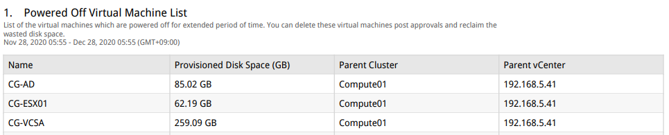 여기서 중요한 부분은 위 날짜는 Time Settings 보다 이전 시간은 포함되지 않습니다. 만약에 기본 설정인 7 Days 로 한다면 대부분 날짜가 7일전으로 확인이 됩니다. 즉, 30일 이상 Powered Off VMs 를 확인하려면 최소한 30일 이상으로 기간을 설정해야 합니다.