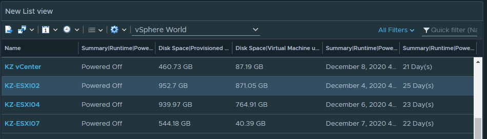 다음과 같이 작성을 해서 가이드를 했는데요. 현재 전원 상태와 함께 프로비저닝 용량, 실제 사용 용량, 전원꺼진 날짜, 마지막으로 전원 꺼진 후 경과 날짜를 확인할 수 있습니다. (정확하게는 Power State 가 변경된 날짜이기 때문에 반드시 Powered Off 된 VM으로 필터를 해야합니다.)