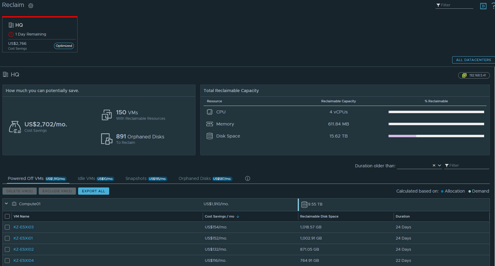 다음과 같이 작성을 해서 가이드를 했는데요. 현재 전원 상태와 함께 프로비저닝 용량, 실제 사용 용량, 전원꺼진 날짜, 마지막으로 전원 꺼진 후 경과 날짜를 확인할 수 있습니다. (정확하게는 Power State 가 변경된 날짜이기 때문에 반드시 Powered Off 된 VM으로 필터를 해야합니다.)